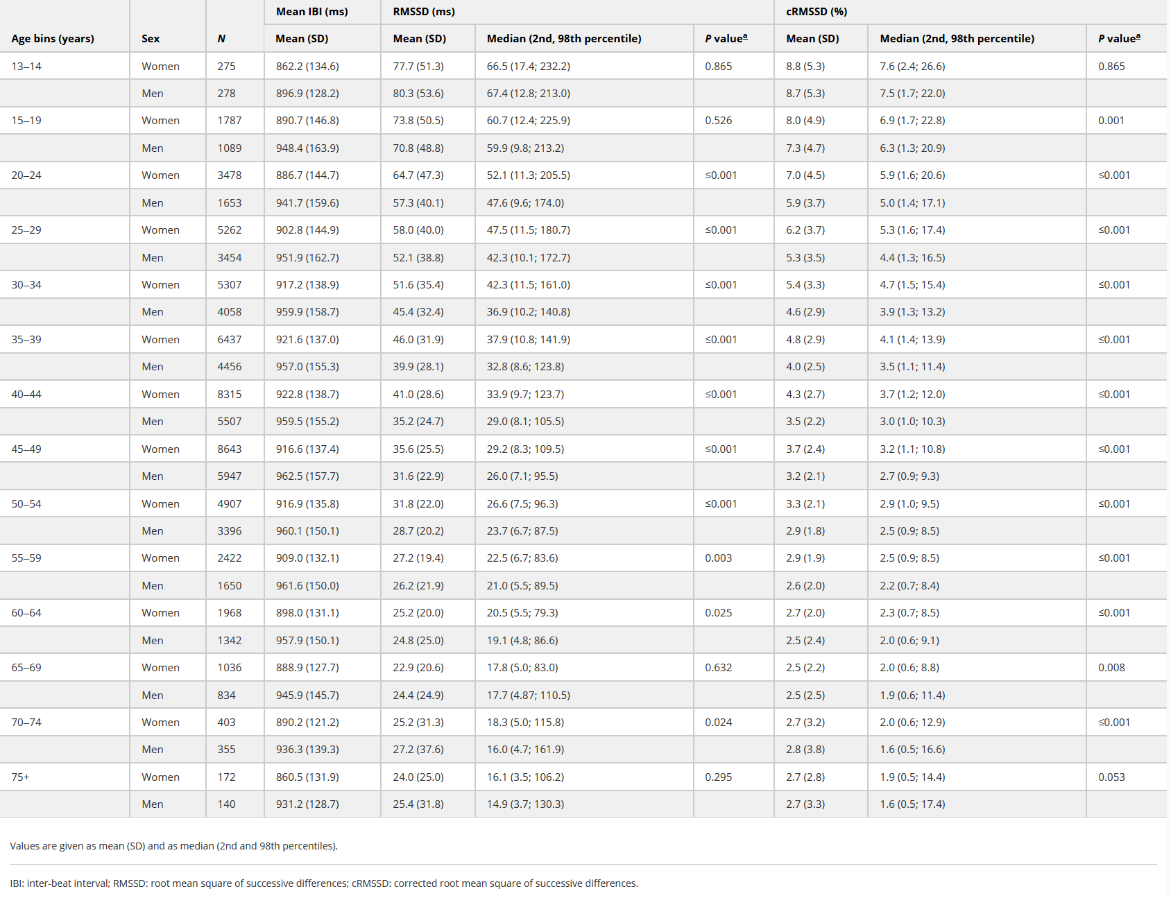 In a recent study by Balewgizie S Tegegne et al, 84,772 participants were used to create what is probably the best indication to date of HRV for each age group.