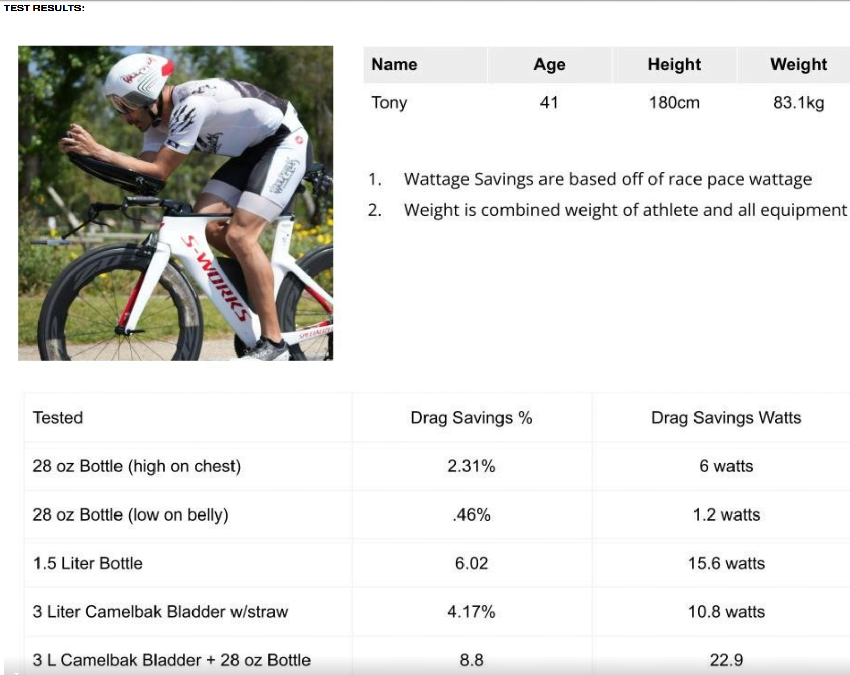 If you are reading this article, I’ll assume you know a little bit about aerodynamics on a bike. For those that don’t; for a given wattage you will go faster if you reduce the frontal area you present to the road ahead AND you will also go faster if the air flows more smoothly over your body. Stuffing a water bottle down your trisuit works on the latter of these effects, I would assume to act as a deflector for the air around your torso.