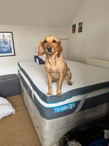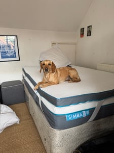 My favourite mattress is the Simba Hybrid Mattress which aids a good night’s sleep – I have two. I thought my dog, images below, was vaguely Simba-like (Simba being a lion). Sorry, it’s the best I could do. Note this bed in our spare loft room also has a Simba topper. Quality toppers can be a great way to make older mattresses more comfortable for a few more years or they add a super luxury comfort boost to an otherwise great mattress – ie what we did.