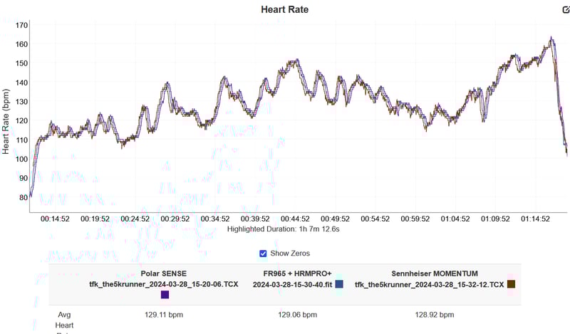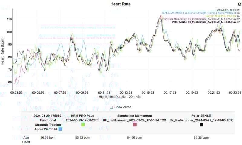 During my testing, I found that Momentum Sport suffers from cadence lock during running workouts but was sufficiently accurate for other exercise types. Here are some examples compared to a variety of other sources of heart rate during the same workouts.