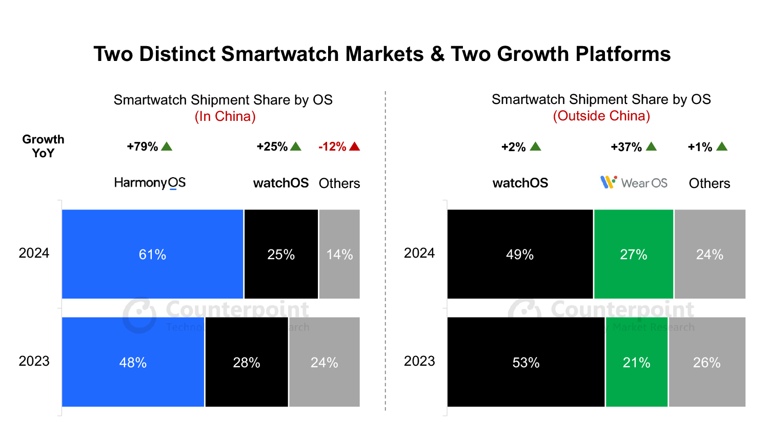 Market Research company, Counterpoint, recently published its latest report on the smartwatch industry with its market share information determined by ex-factory shipments (to retailers and distributors) and split between the two distinct geographical markets of China and Rest-of-the-World.