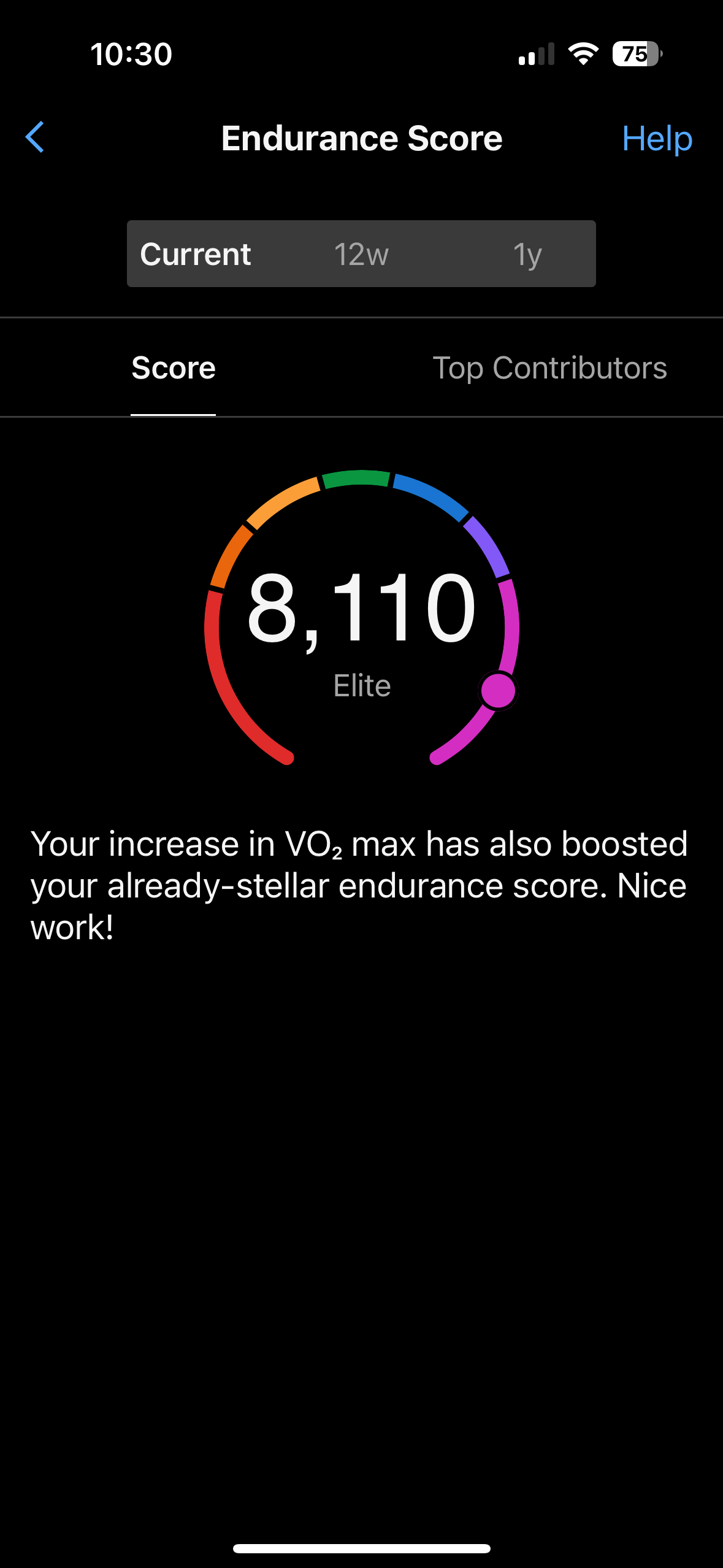 My annoyance, or problem, is that Garmin is saying I’m ‘elite’ in my endurance Score. Look at the image above, it’s literally written in black and white! My score was even higher around this time last year (8137) as I cranked up some decent base cycling miles.