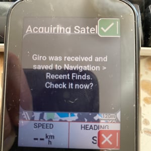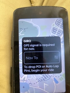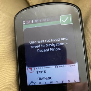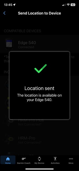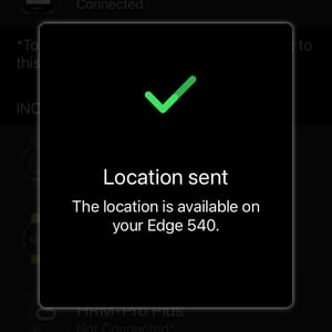 As the following images show, you press, hold and share the Pin location to the Garmin Connect app. Assuming that Connect is open and your Edge is linked to it, you can easily send the Pin to any compatible Garmin device. In my quick tests, the Edge 540 behaved slightly differently when receiving the Pin depending on whether a workout was active or if a navigation was active. Either way, I got stuck at the point shown in the last image. The only way I could initiate the navigation was from the ‘Navigation>Recent Finds’ menu option, several taps/clicks away. A blue area appeared on the screen which I suspect would let me start the navigation to the PIN however the button-only version wasn’t able to select it, maybe you have better luck with an 840?