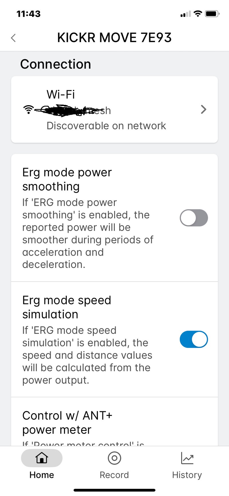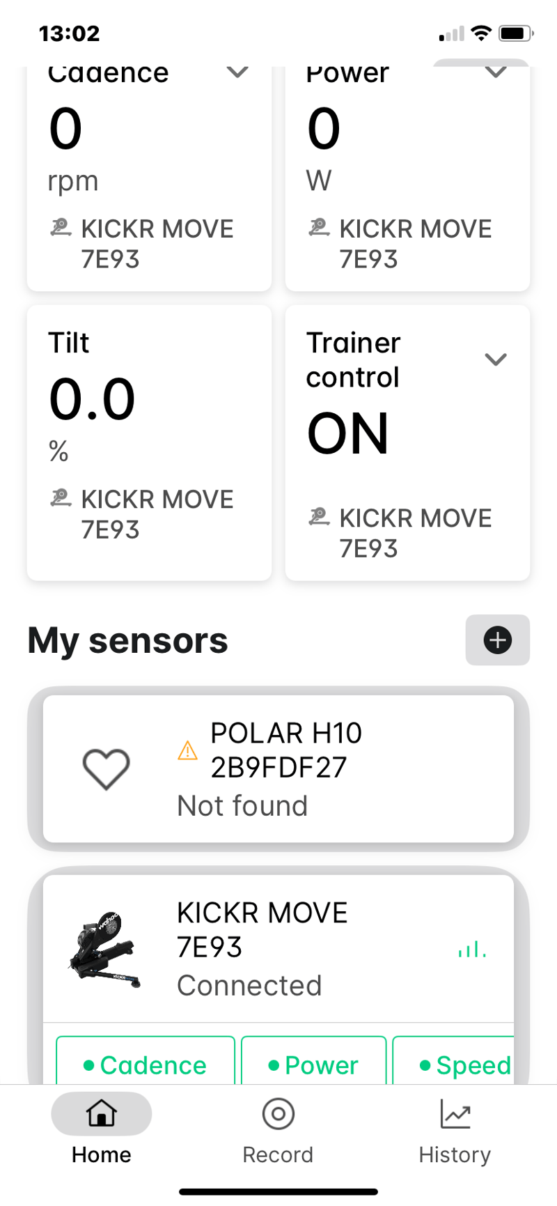 Pair KICKR MOVE to the Wahoo app (not the ELEMNT app). Log into your home WiFi here (use a cable if you can), and once you’re done, KICKR will automatically update its firmware when needed. The app shows that KICKR MOVE is the source of Speed, Power, Cadence, and Tilt and Trainer Control information. Provide a backup sensor pairing here if you have one, and you should also find that KICKR HEADWIND and CLIMB automatically pair if they are nearby and on.