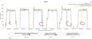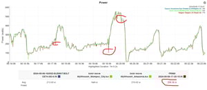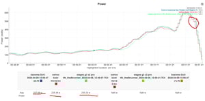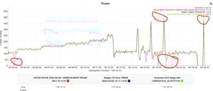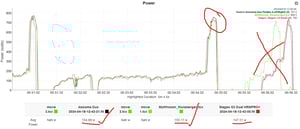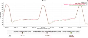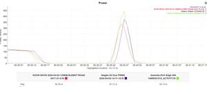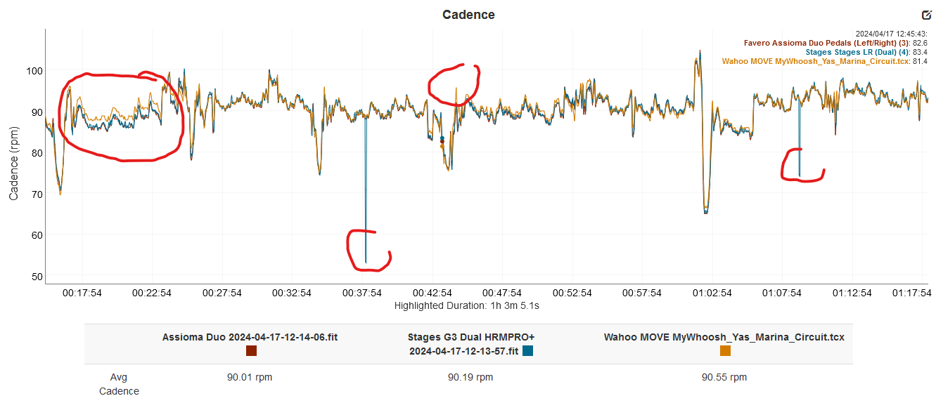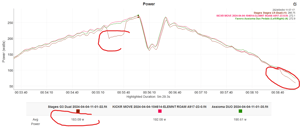The rides on MyWhoosh sometimes require me to combine 3 KICKR data sets on DCR’s Analyzer tool. The three separate KICKR files are displayed in the same colour as other PMs in different colours. Sometimes, the times were out of sync, and having multiple files for one PM also meant that the mean-max curve didn’t work.