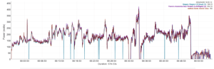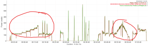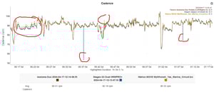 Cadence data on KICKR is derived from mini accelerations during the pedal stroke. There seem to be a few lags or overestimates with the KICKR cadence, but I’m not worried about that. Unlike many outdoor power meters, KICKR does not need cadence to calculate power. Cadence is far more important to get right for other types of power meters. This chart shows a strange overestimate for an extended period at the start of a ride. It doesn’t affect the power.