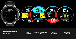 Track your dives with separate underwater and surface views. The device also includes multiple alarms for depth, dive time, and ascent/descent speed.
