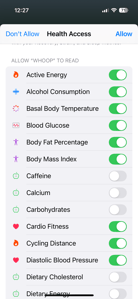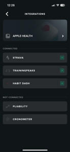 Then you need to go into the Whoop app and give it access to the same data. You do this via the INTEGRATIONS>Apple Health menu