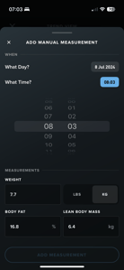 I use a Garmin S2 Smart Scale which transfers body composition data to the Garmin Connect app. Whichever source app you use ensure it has permission to write the body comp information to Apple Health (or Google for Android). Make a reading and check it is added in the “All Recorded Data ” section.