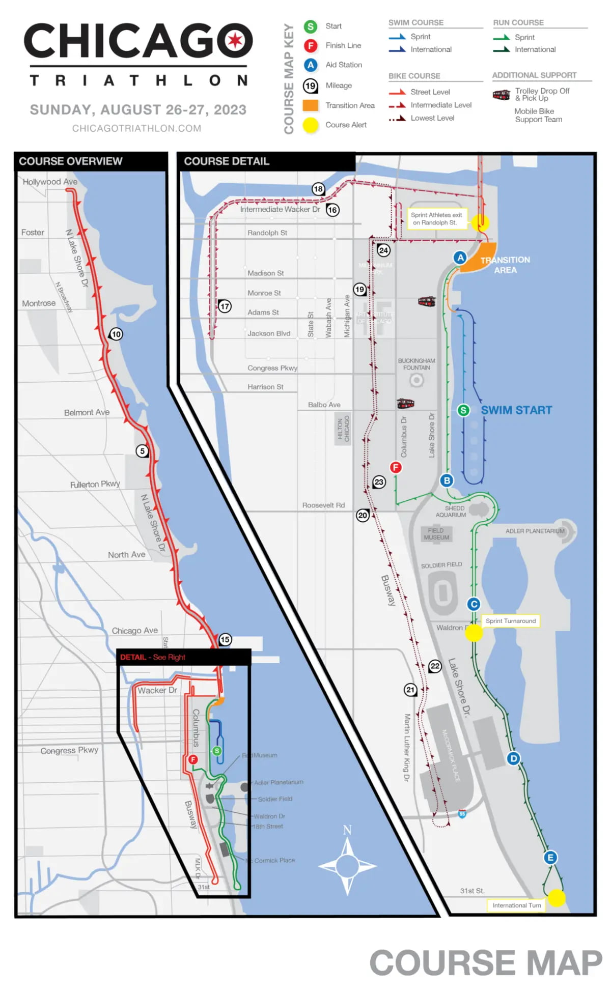 The triathlon takes place over the weekend of August 24-25, 2024 and incorporates three distances Sprint (24th, 8 am), Standard/International (25th, 6 am) and super sprint (25th 10 am) each in either an individual or relay format over: swimming, biking, and running. All races are morning starts. The swim is in Lake Michigan with mostly flat bike and run sections along Chicago’s beautiful lakeshore. Historically the races have been well supported by course-side spectators and it will make for interesting TV watching, events will be covered here.