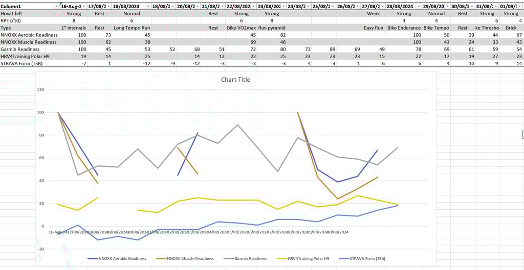 I’ve put the readings into a spreadsheet with similar data from other tools. Garmin Readiness and HRV4Training produce waking readiness values whereas Strava’s FORM is like Training Stress Balance/TSB, calculated for the current day based on previous days.