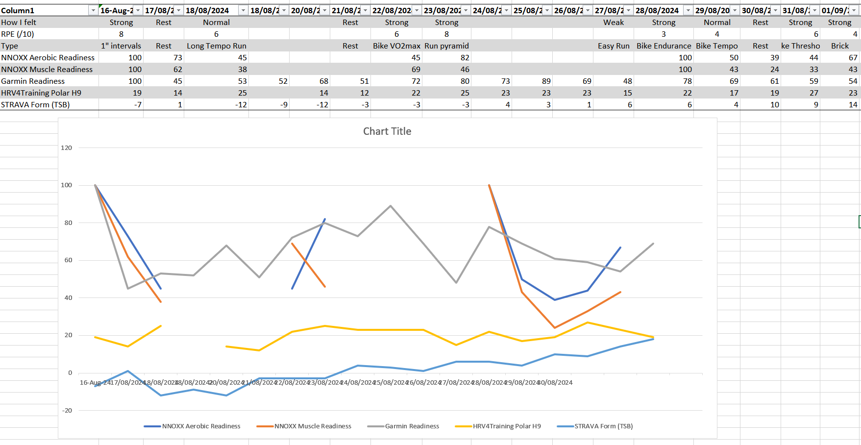 I’ve put the readings into a spreadsheet with similar data from other tools. Garmin Readiness and HRV4Training produce waking readiness values whereas Strava’s FORM is like Training Stress Balance/TSB, calculated for the current day based on previous days.