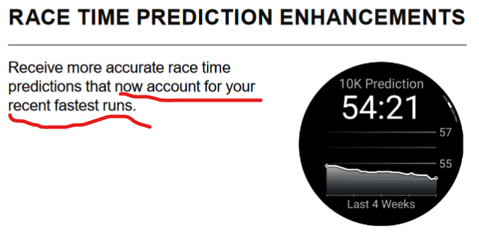 Also announced today are improvements to running race time predictions based on history, fitness and performance. Again, I highlighted that change to readers a few months ago and this specifically addresses an obvious bug that I and many others reported when a recent fast run shows you can run faster than Garmin’s estimate.