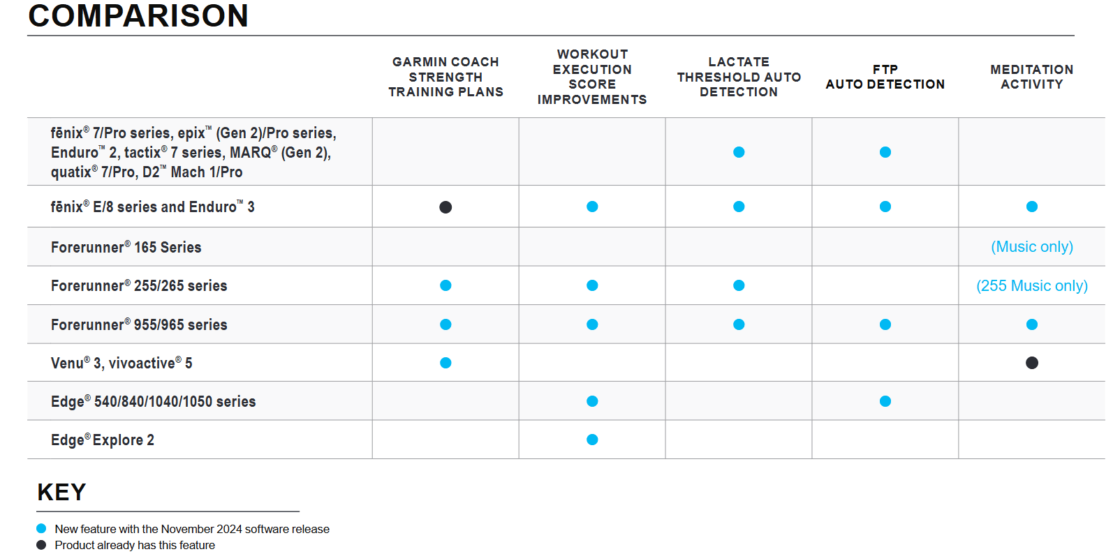 - Strength Workouts – The strength coach was added to Forerunners in Nov 2024, and the Strength training plan at a similar time. Adaptive Plans also gained explanatory improvements. We now see strength workouts incorporated into Garmin Run Coach and Garmin Cycling Coach.