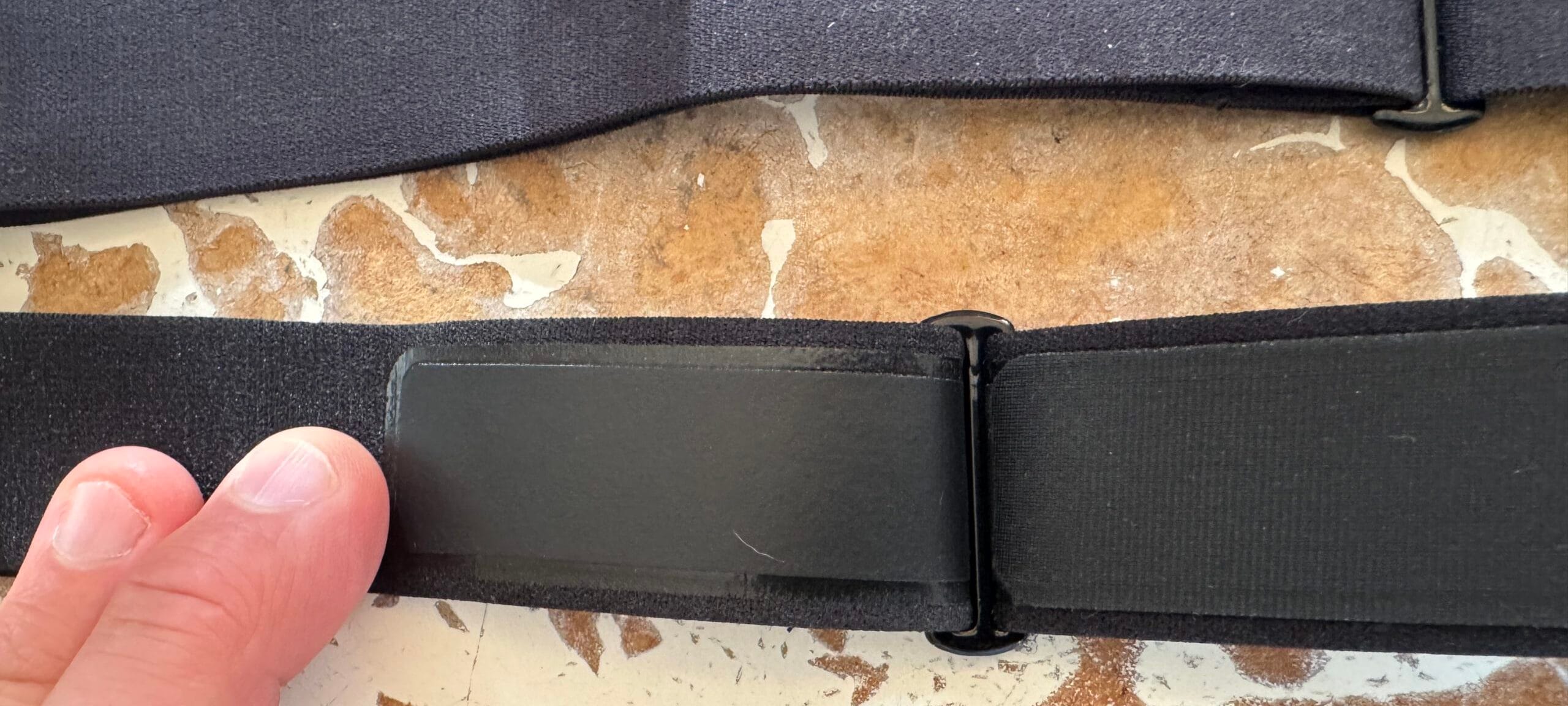 - As the strap is worn 180 degrees from normal, how will the sensing pads pick up heart rate? A: It’s a custom strap with extended sensing pads extending to the body’s front to collect HR data in the usual location. This seems to work surprisingly well. The only issue was that the sensing pads were long and slightly thick, and I had to thread them through the strap-shortening mechanism. All seemed good, tho – see image below.