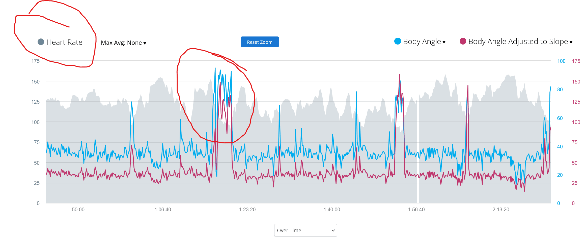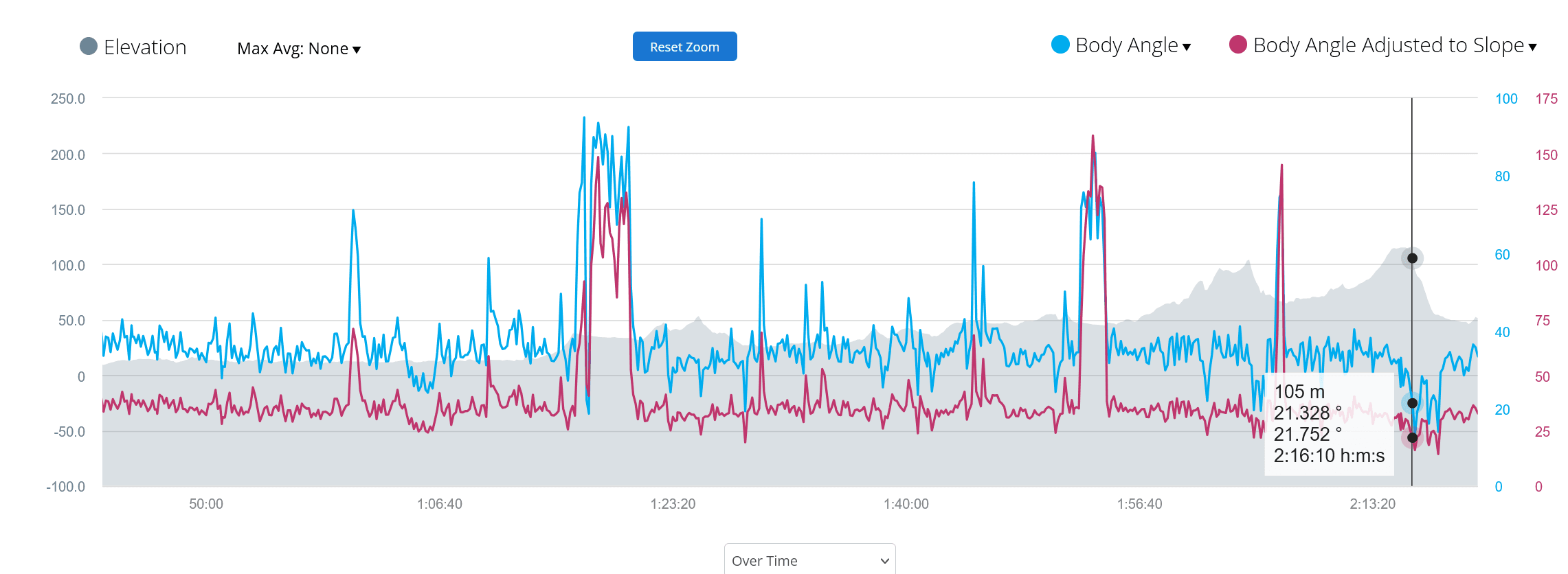 Toward the end of the ride section, represented by this graph from Garmin Connect, you can see a downhill section where the adjusted body angle appears less steep (correct) than the raw, unadjusted angle.
