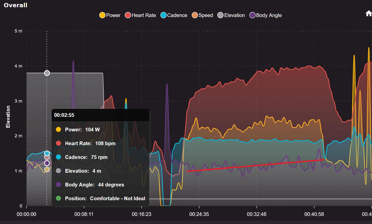 This chart is from a Darefore test where I used a Technogym spin bike at my gym. I maxed out my seat height and slammed the bars as low as they would go. It was just about rideable. The point of this test was that it was in a controlled environment, and I was only exerting minimal power (100w, something like that). But I was steadfastly holding a position for 4 minutes, then repeatedly changing and holding a new position. I went from bars to hoods, to aggressive hoods, to a TT bar position. You can see that Darefore tracked these changes extremely clearly.#NiceJob.