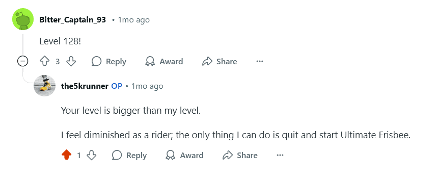 I was then spurned into action by Reddit user u/Bitter_Captain_93, who was 100 levels above me. He probably deserved it, but in today’s world of getting achievements without actually doing much to get them, I felt I did, too. I’ve bought a bike and loaded my computer with MyWhoosh. Isn’t that enough for a medal?
