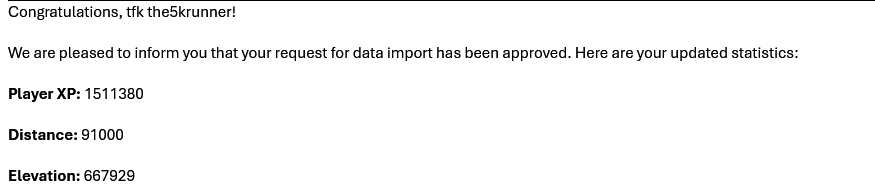 A few days later, I got an email confirming my data import was approved. I was credited with 91,000 km, over a million experience points and about 500ish miles of elevation gained. I’ll take that.