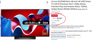 This is widely available, including from Amazon. Prices vary according to the size chosen, with the list price for the 48″ model being £1000 or $926. As you can see, below, this model is now being discounted significantly, including at the time of writing £819.