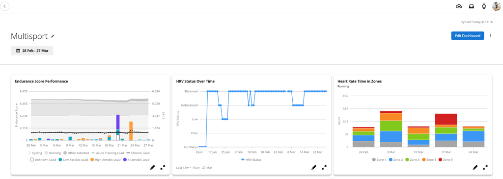Performance Dashboard – this is online only, and you can access it here https://connect.garmin.com/modern/performance-dashboard. I liked where Garmin was going last year with the web dashboard but disliked its aesthetics on the Connect app. The online dashboard works by offering a choice of four templates, which can then be personalised. The reconfiguration process was convoluted, but I ended up with something like this.