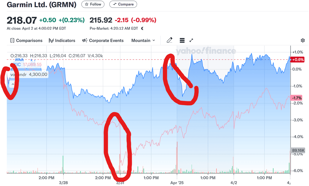 Turning to more impactful, contemporaneous events, it seems that the dread of generic US Import Tariffs (3/31 and 4/1) received different reactions, with GRMN not falling on the initial market fears (3/31) but rather instead falling the day before the announcement (you might speculate that country-specific insider info was leaked on that someone in the authorities if you like).