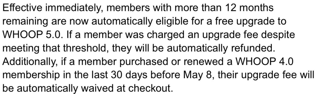 Whoop has done the right thing and mostly backtracked to a sensible position. Now, if you have over 12 months on your subscription, which means only those signing up to a 2-year commitment get this, you will get a free upgrade.