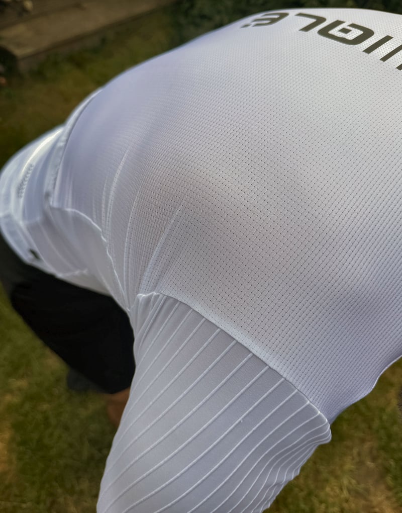 - Comfort (4/5): The sleeves feature laser-cut edges, designed to reduce drag and chafing, thereby enhancing comfort during long rides. Like me, you will probably be looking closely at this top because of its ribbed, aero shoulder material. This should give a decent performance benefit to those already in a good aero position. Elastic at the waist prevents ride-up, but for even better aero performance, you will want a one-piece design to eliminate the effect of waist seams.