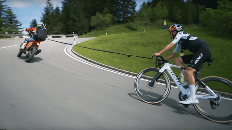 The comic bit at the end of the video is where he ties himself to the motorbike with a rope, and he and the bike rider are overheard discussing a 120km/h uphill attempt with it. That’s one way to get a KOM I suppose.