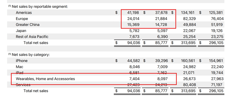 Apple’s latest Q3 earnings report usually contains no clear information about Watch sales besides grouping it in the Home & Accessories category. As the following extract from the Q3 chart shows, there has been a significant year-on-year drop in Wearables, Home and Accessories sales.