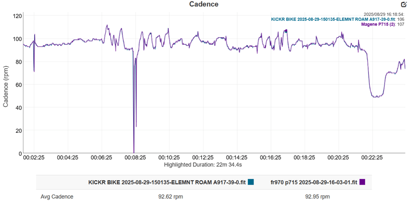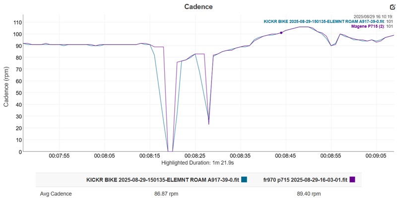 Here are some cadence charts for the same ride, with the section where I stop pedalling shown in detail to the right. You can see that maybe the Magene has slightly sticky cadence. For cadence, it doesn’t really matter.