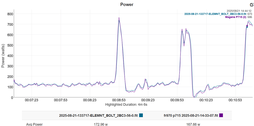 Same story here with Magene’s pedals, where the KICKR PRO is 3% higher and perhaps should be 1% lower. There may be some seemingly sticky watts here at 10:00 and 11:00; however, there is cadence at that exact moment, so it’s not sticky watts but rather ‘something else’.