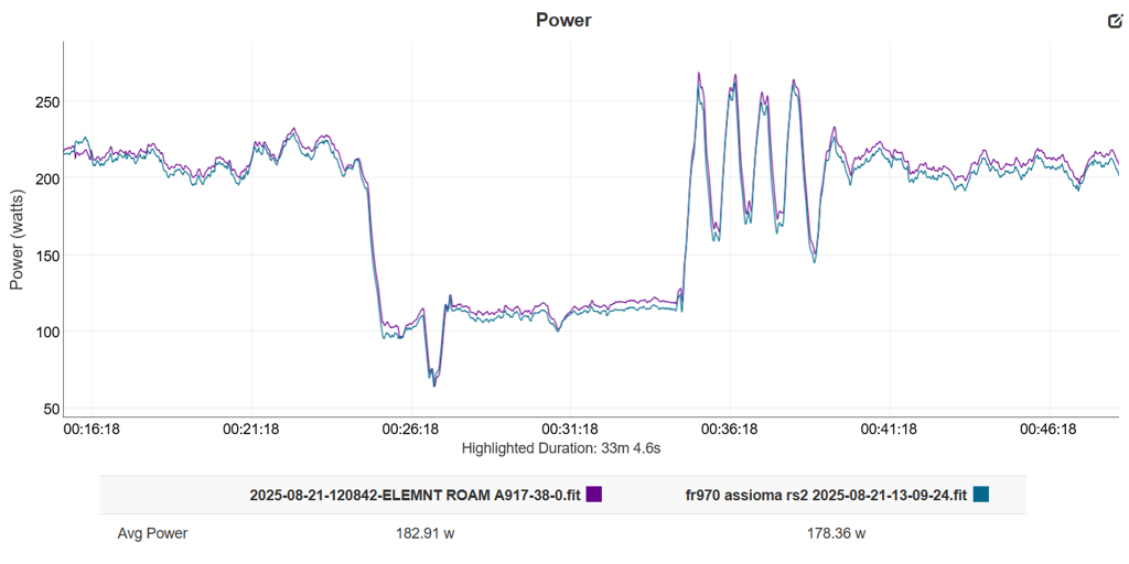 There’s a continuous difference here of about 2.5%. But new, calibrated Assioma pedals are reading lower when, if anything, they should be higher. Also note that my Assioma pedal power readings agree very closely with my 4iiii Precision 3+ Pro powermeter (Dura Ace) in other tests. I.e. I’m reasonably sure I’m using accurate comparators.