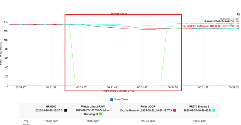 Putting the dropouts aside, the rest of the HR data is excellent, both from the Watch Ultra 3 and the new Polar LOOP. The data is compared to a Garmin HRM 600 strap and a Garmin Elevate 5 optical sensor.
