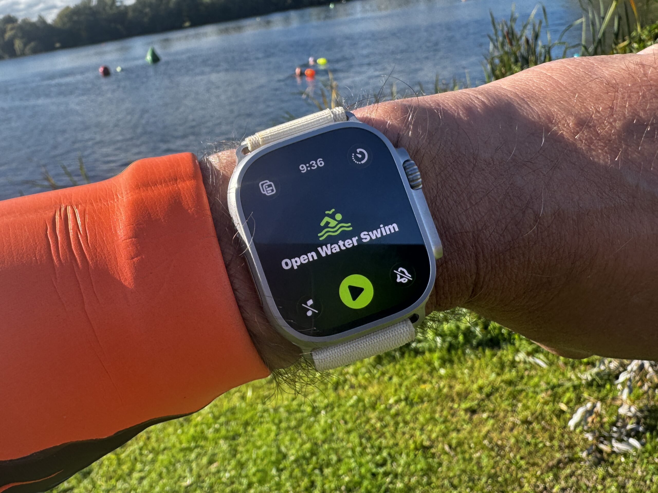 I wore the Watch Ultra 3 and Forerunner 970 on each wrist with my wetsuit sleeves rolled back for the photos, but pushed further up the arm and covered by the wetsuit material. I had a Garmin HRM 600 chest strap separately recording an HR track and a Polar Grit X2 in my pool buoy as a reference track. The Workout app recorded the track on Apple using dual-frequency GNSS, and the Forerunner 970 was set to use SatIQ (L1+L5 on demand) and the Elevate 5 optical HR sensor. With Polar LOOP on one biceps and Whoop on the other, I was ready to go.