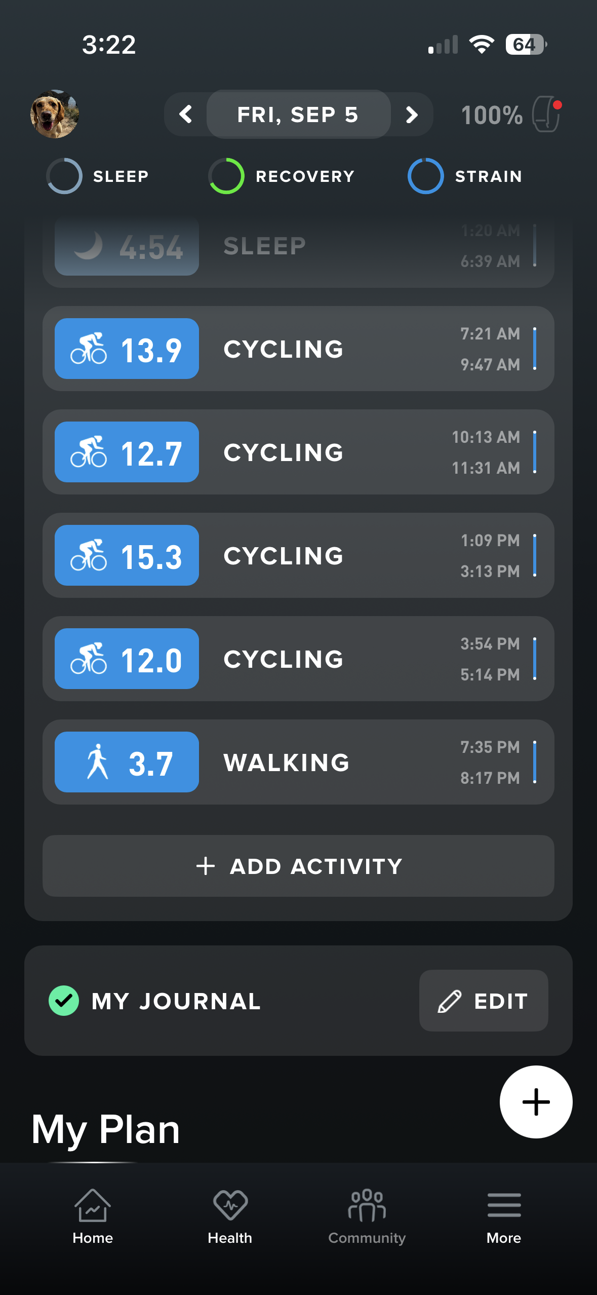 Here is how the score was made up. Handily, because of the coffee stops, Whoop recorded four separate rides, and I also took the dog for a 4km walk when I got home. Here is the very basic math on the STRAIN: 13.9 + 12.7 + 15.3 + 12.0 + 3.7 = 20.2