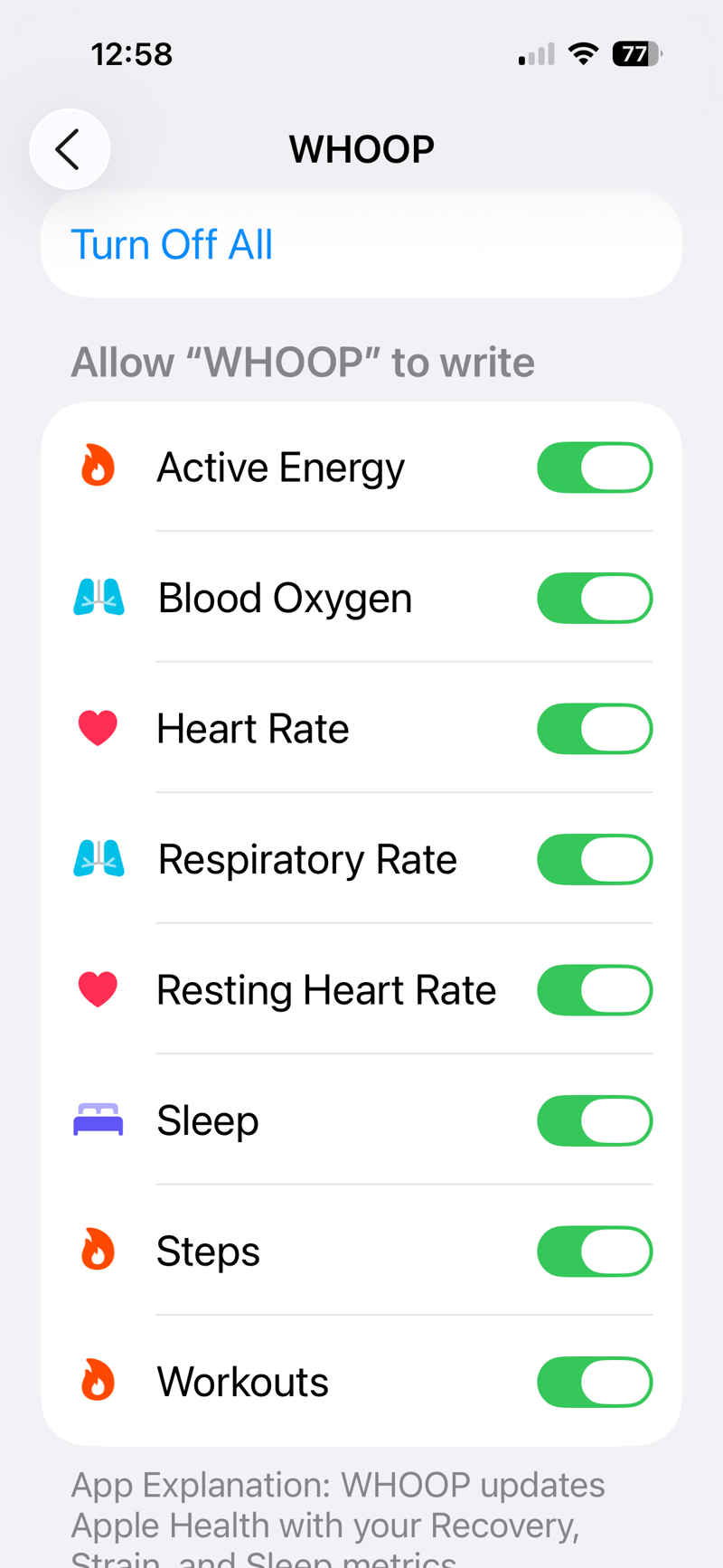 I find it especially odd, as Whoop uses clear mechanisms to share your data and requires your explicit approval. In the case of Apple iOS, the mechanisms are effectively policed by Apple, as shown in the screenshots below. So, I’m unsure if the claimant is alleging that data was shared by a Whoop employee or from the Android platform, the web platform, or erroneously from its iOS platform.