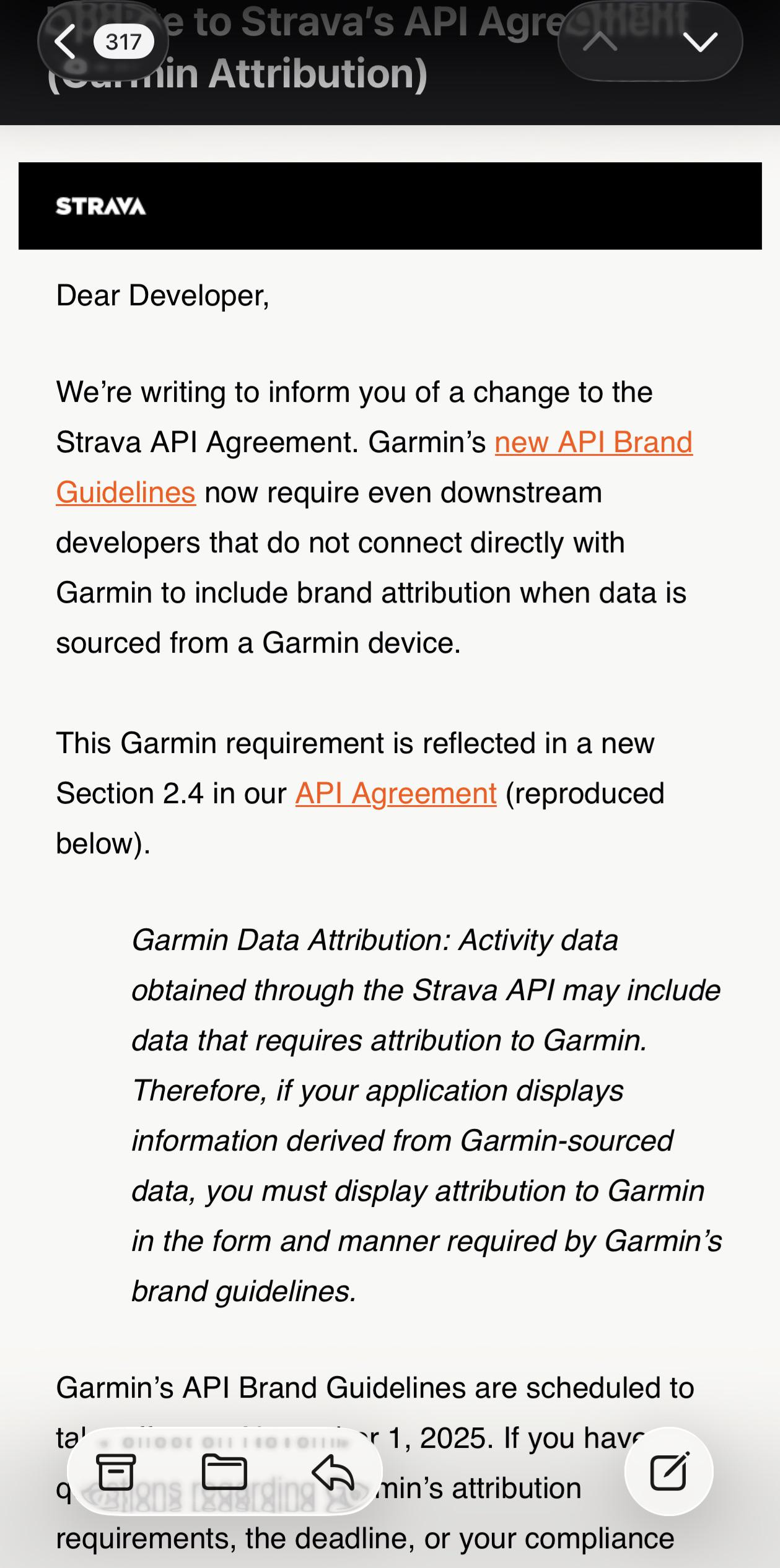 This is the next step on Strava’s side of the climbdown, as it became the obvious next move after the company told its partners last week that they also had to comply with Garmin’s API citation, as shown by the following message to developers.