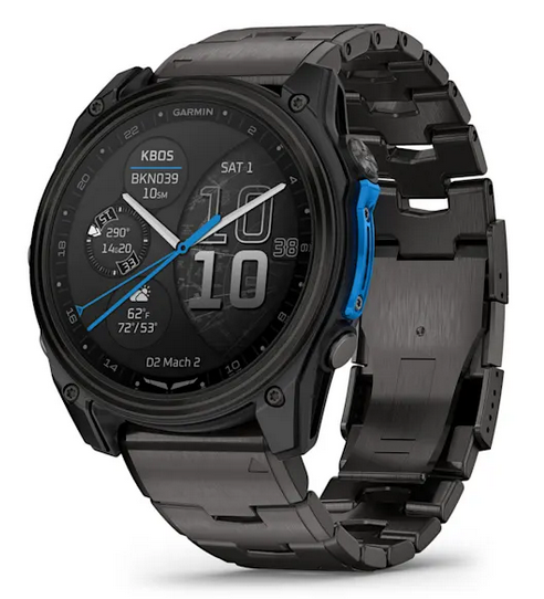 Garmin’s D2 Mach 2 is the company’s pro-grade smartwatch for aviators, released alongside the cheaper D2 Air X15. Both integrate well with Garmin avionics; there are some small differences between the two models in aviation-related features, but the key differences are in the quality of materials, maps and price. The range is topped by the MARQ Aviator (Gen 2), a somewhat dated model built with a superior shell but based on previous generation technology and due for a refresh.