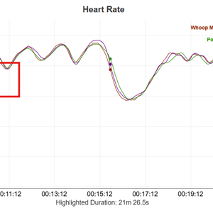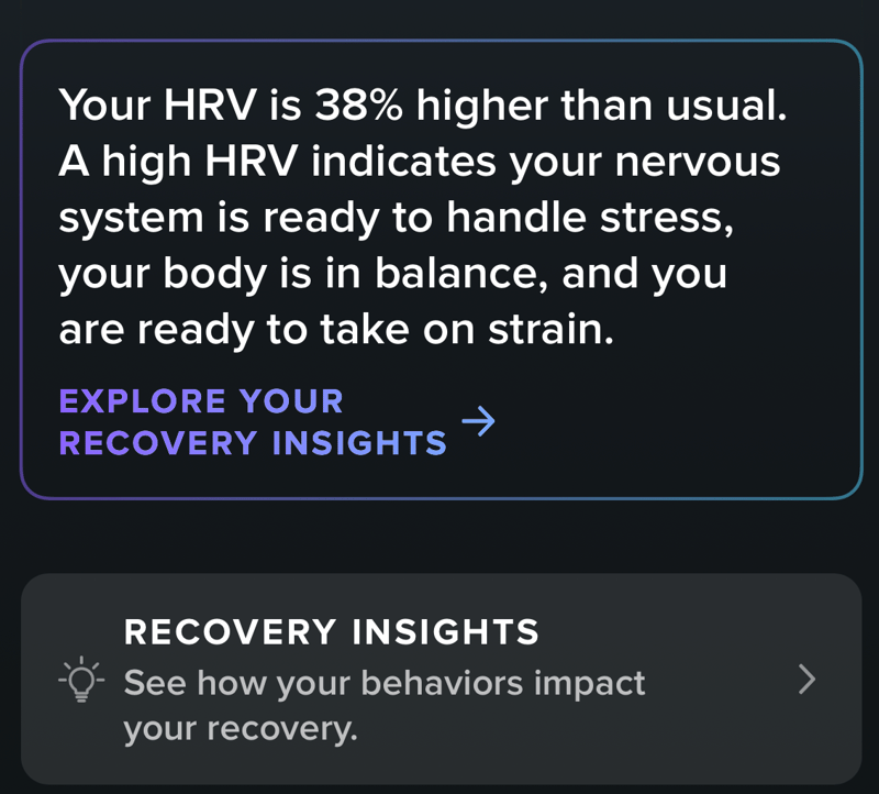 Broadly speaking, WHOOP subsequently assesses the correct recovery and readiness from HRV as your body adapts to a completed strength workout. I’ll caveat that by pointing out that every common sports ecosystem, including WHOOP, measures overnight HRV, but its interpretation only applies to your resting physiology, not your exercise physiology. So, the readiness information is not quite right, but close.