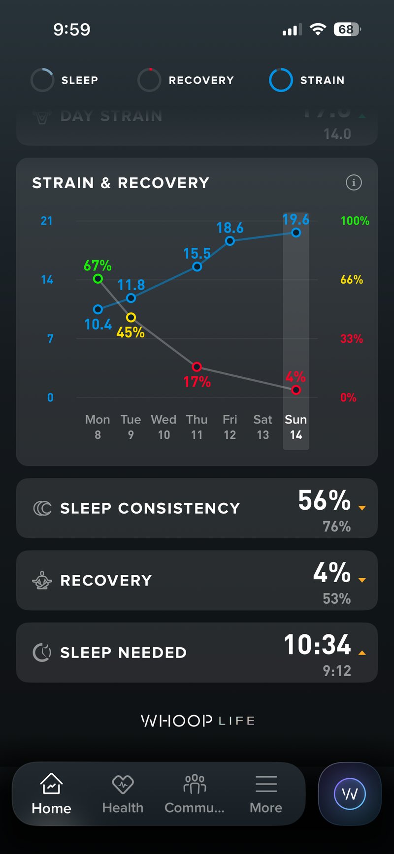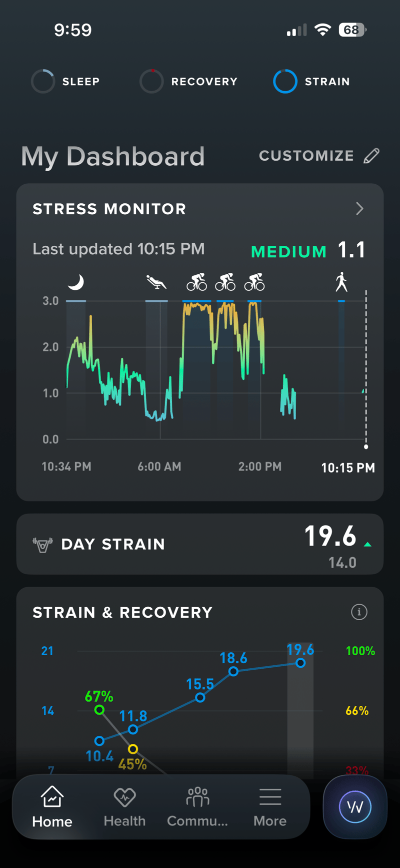 WHOOP’s strain score is algorithmic and ranges from 1 to 21. Thus, moving from 9 to 10 is easy, but pushing a score of 19 toward 20 is considerably challenging.