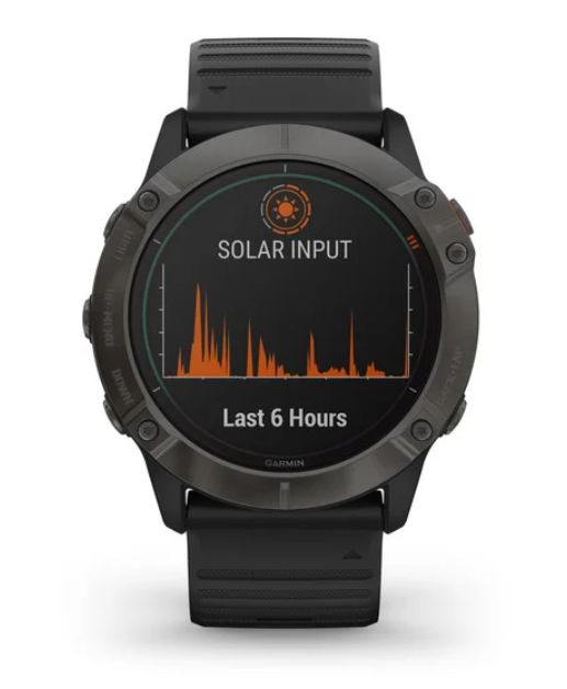 Solar intensity can be displayed on a Garmin watch face or a dedicated widget, typically showing the power gains over the past six hours. For maximum charging efficiency, the watch lens must directly face the sun and remain uncovered.